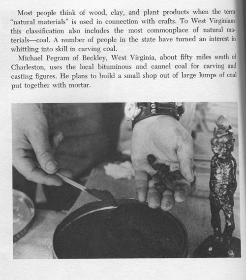 The book then focuses on "Snake Canes, Wooden and Corn Husk Flowers, and Coal Craft." This guy has figured out a way to make souvenirs out of the plentiful coal: